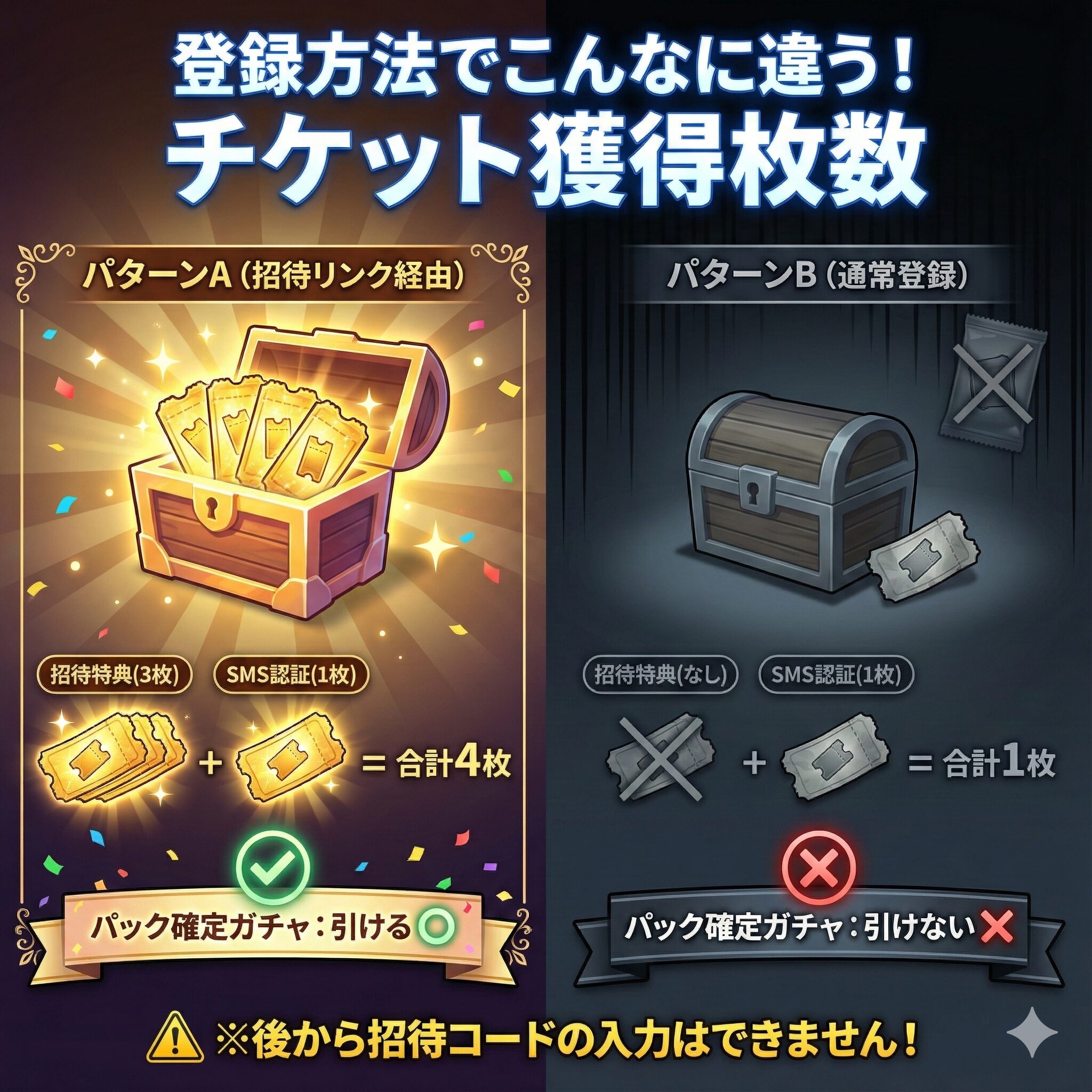 ここで重要なのが、「招待リンク」を経由するかどうかで、使えるチケットの枚数が劇的に変わるという点です。