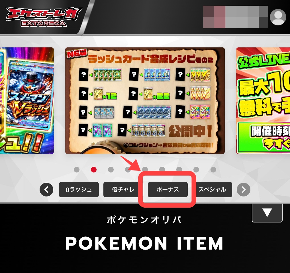- エクストレカTOPページの「ボーナス」タブをタップ