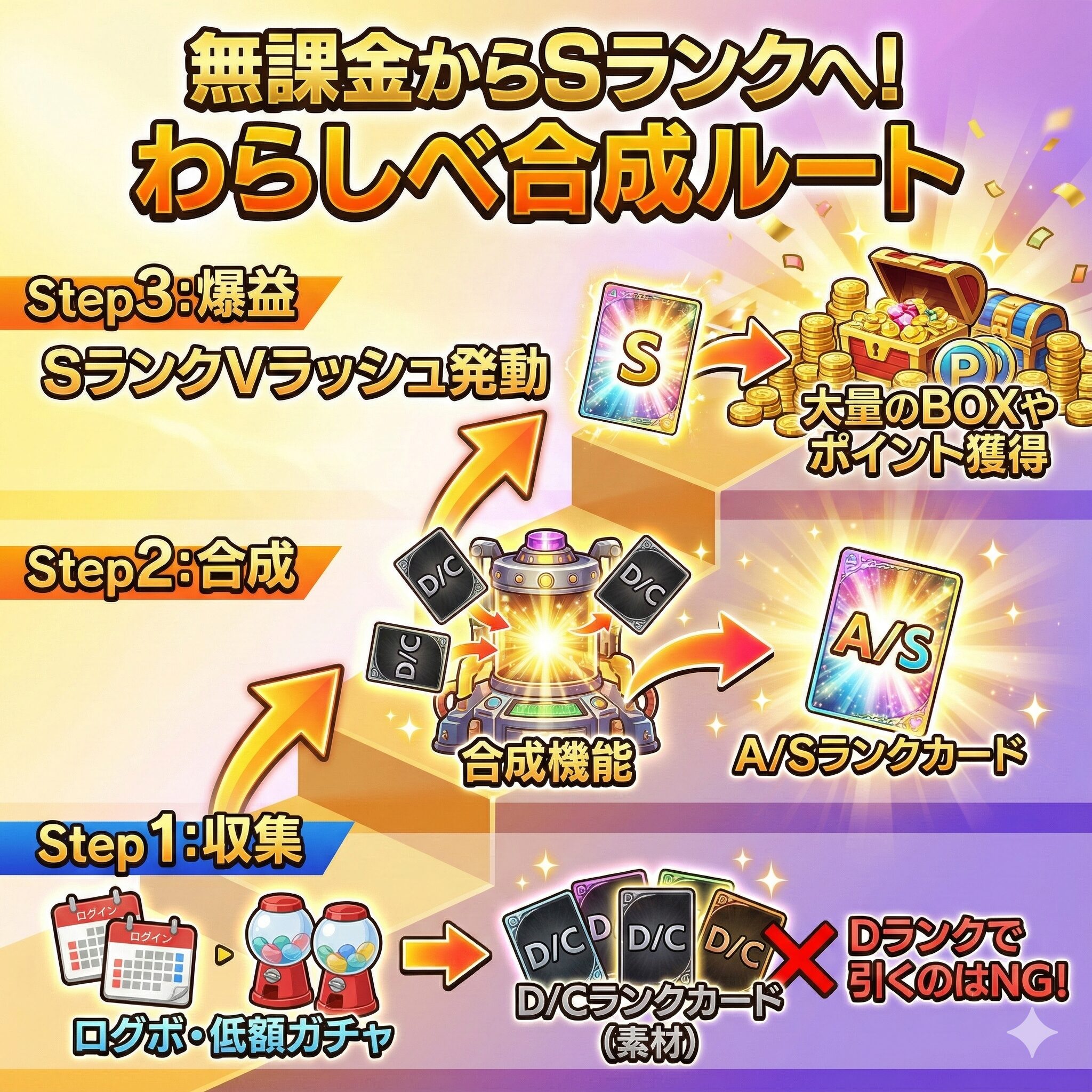 - 【合成】: 集めた下位カードを「合成機能」に投入します。リスクはありますが、成功すればAランクやSランクに進化します。