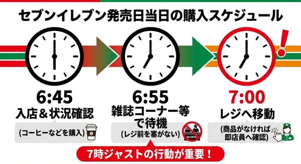 セブンイレブンで発売日当日にポケモンカードを確実に購入するためには、販売開始15分前の「6時45分」に入店し、待機することが重要です。