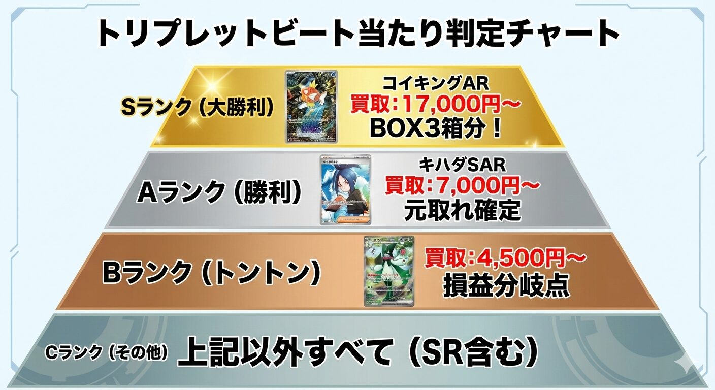 結論から述べると、トリプレットビートのBOX定価(5,400円)を単発で回収できるカードは、全73種類の中で以下の3枚のみです。